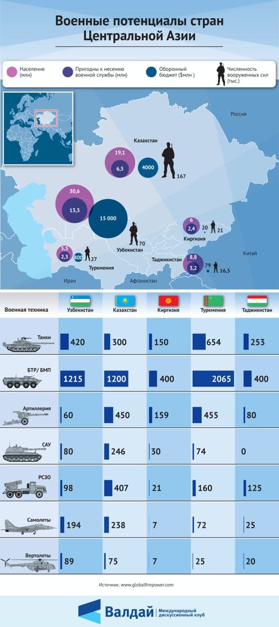 Vojenský potenciál štátov Uzbekistan + Kazachstan + Kyrgyzstan + Turkmenistan + Tadžikistan