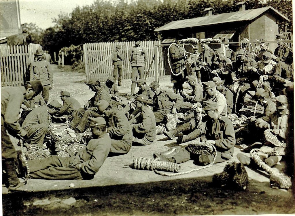Rakousko-uherští vojáci desáté armády vyrábějící na zimu slaměné boty v září 1916. Ty byly nošeny přes normální boty, aby byly izolovány proti chladu.