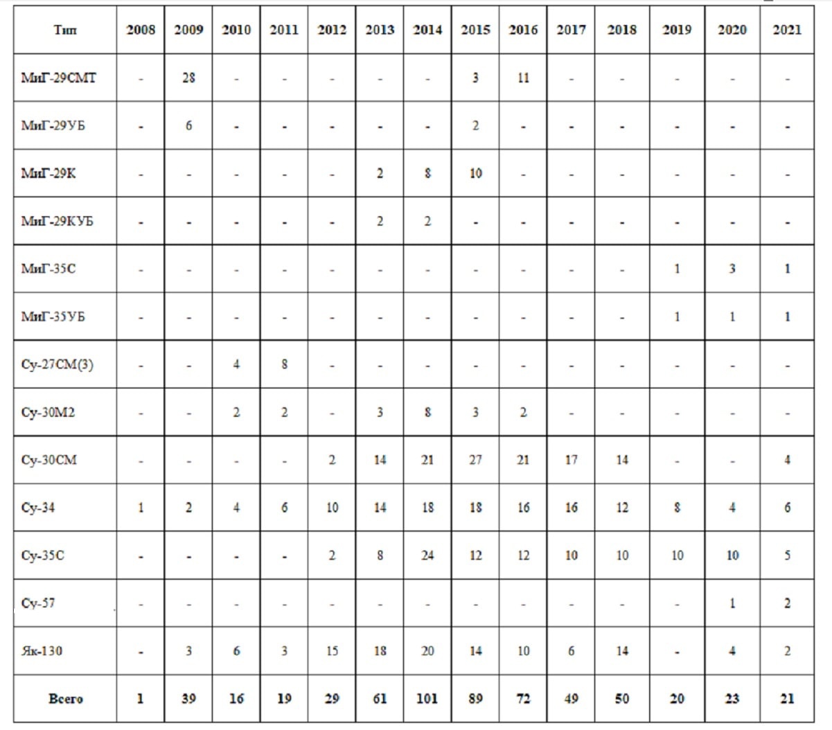 Prehľad dodávok niektorých typov novo vyrobených lietadiel od roku 2008 do 2021: