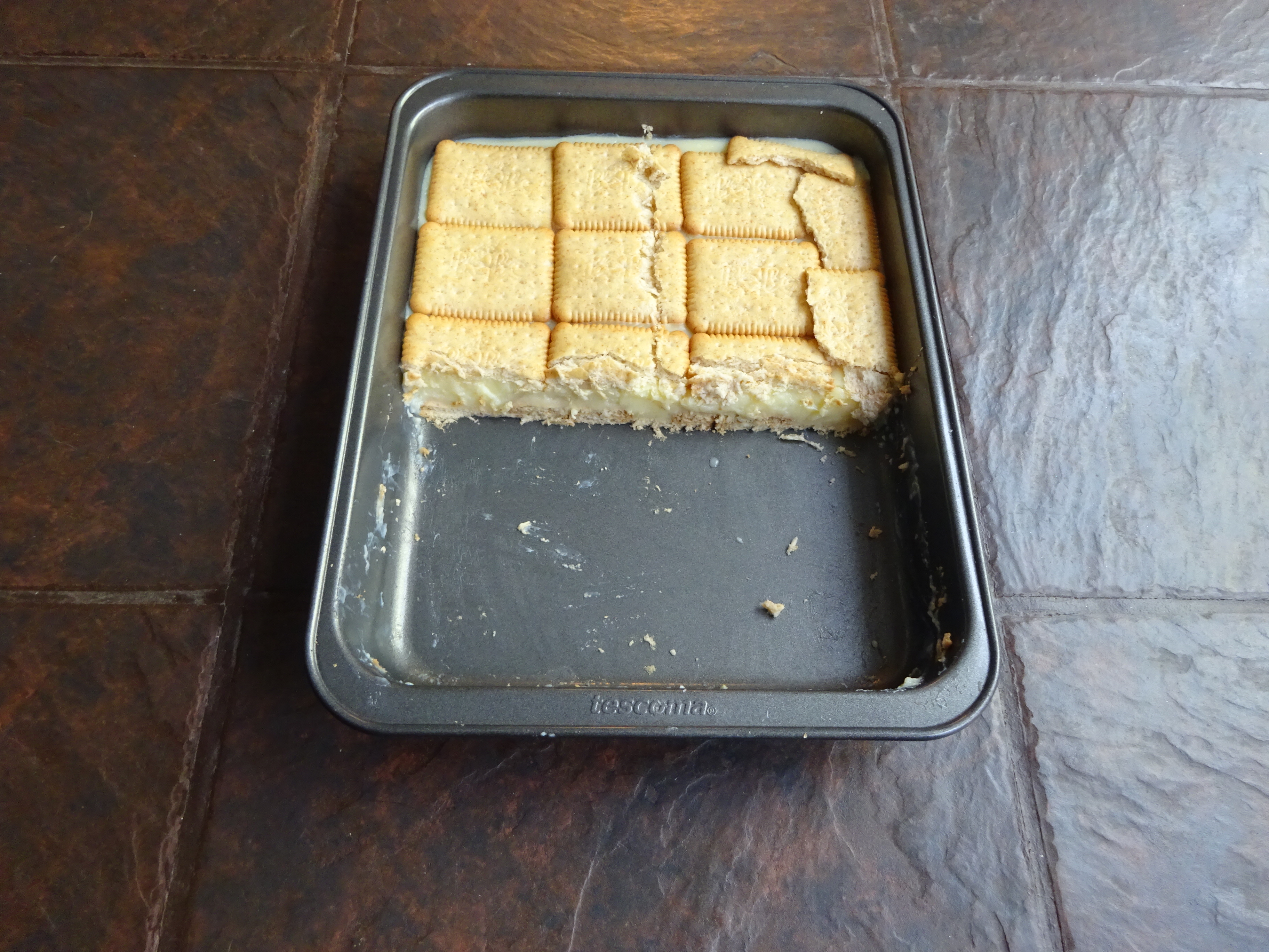 Malý plech,pekáček,nebo zapékací miska.Na dno poklademe sušenky,nalijeme na ně uvařený puding.A na puding další vrstvu sušenek.Přikryjeme poklopem,nebo strečovou fólií a necháme puding vychladnout.Sušenky pěkně navlhnou a jsou měkké.