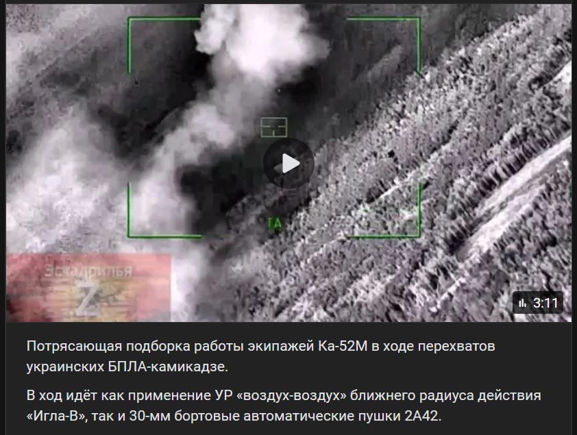 Video https://vk.com/video-123538639_456317601 dĺžka 3:11 min.Ohromujúci výber prác posádok vrtuľníkov Kamov Ka-52M počas likvidácie ukrajinských BPLA-kamikadze.