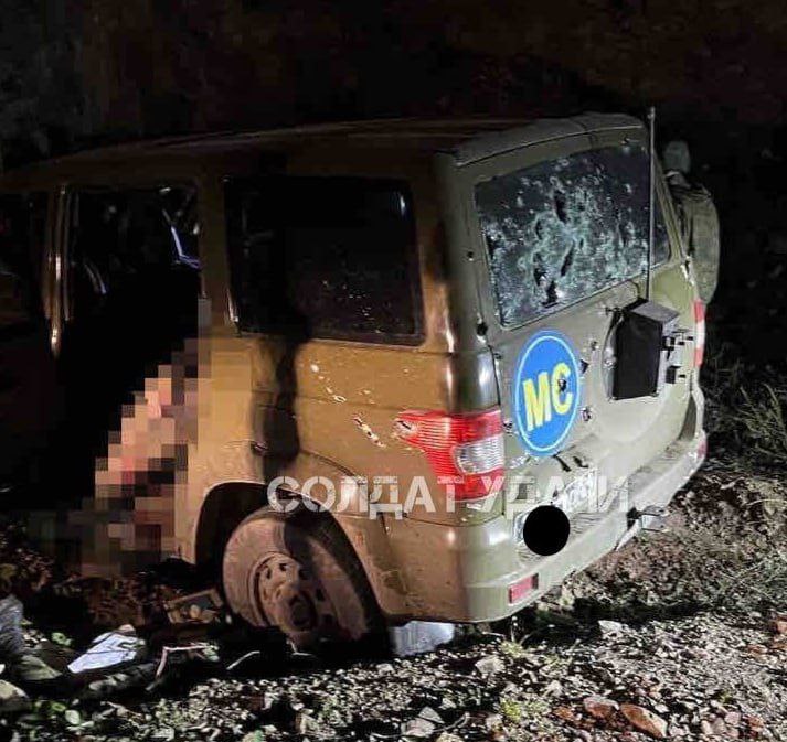 18+ Fotografie auta s ruskými mierovými silami, ktoré deň predtým zastrelili azerbajdžanskí vojaci. Ruské symboly a nápis "MC" sú jasne viditeľné.