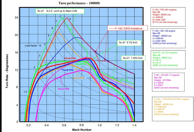 Má to být z Manuálů. Něco jsem ověřil a celkem to sedělo. Mám F4,14,15,16 a Su-27, v grafu jsou zaneseny omezení u Su 27 podle manuálu, stejně tak sedí maximální ustálená G pro F-15, je označen systém OWS. Tedy takto , celkem se to zdá být překvapivě celkem OK.