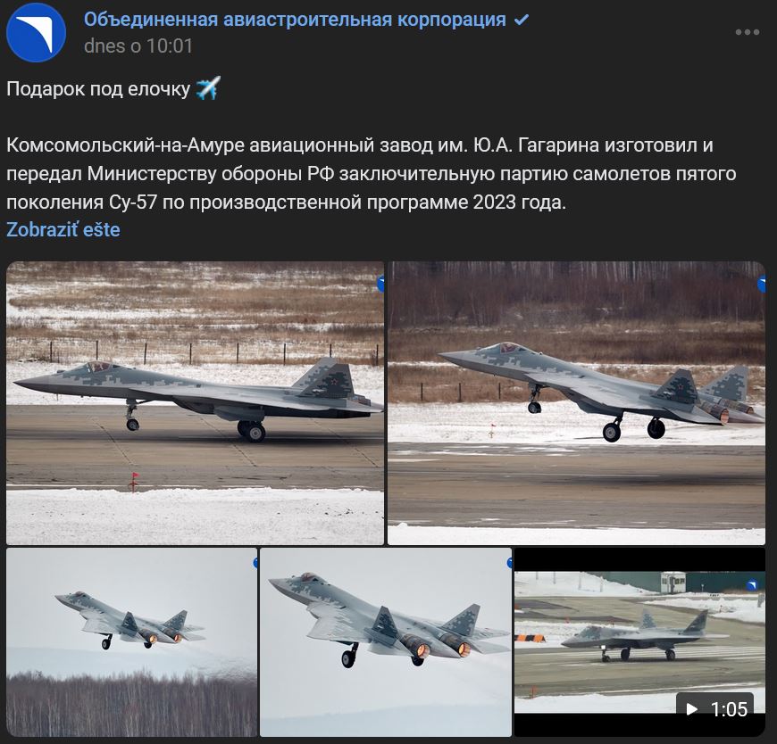 Letecký závod v Komsomoľsku nad Amurom Ju. A. Gagarina vyrobil a odovzdal Ministerstvu obrany RF poslednú sériu lietadiel 5. generácie Suchoj Su-57 (Су-57) v rámci výrobného programu v roku 2023 ... V roku 2023 KnAAZ Ju.A.Gagarina (КнААЗ им. Ю.А. Гагарина) úspešne splnil štátnu obrannú objednávku, keď dodal VKS Ruska všetky zazmluvnené lietadlá Suchoj Su-35S (Су-35С) a Su-57 (Су-57). Video https://vk.com/video-211699782_456239203 dĺžka 1:05 min.