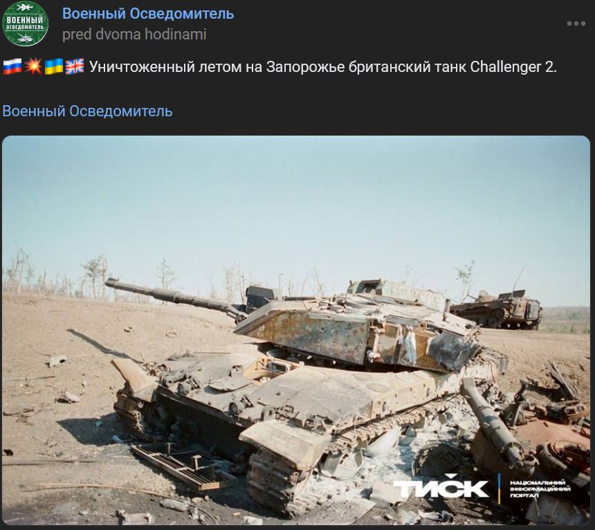 Britský tank Challenger 2 zničený v lete 2023 na Záporožskom smere.
