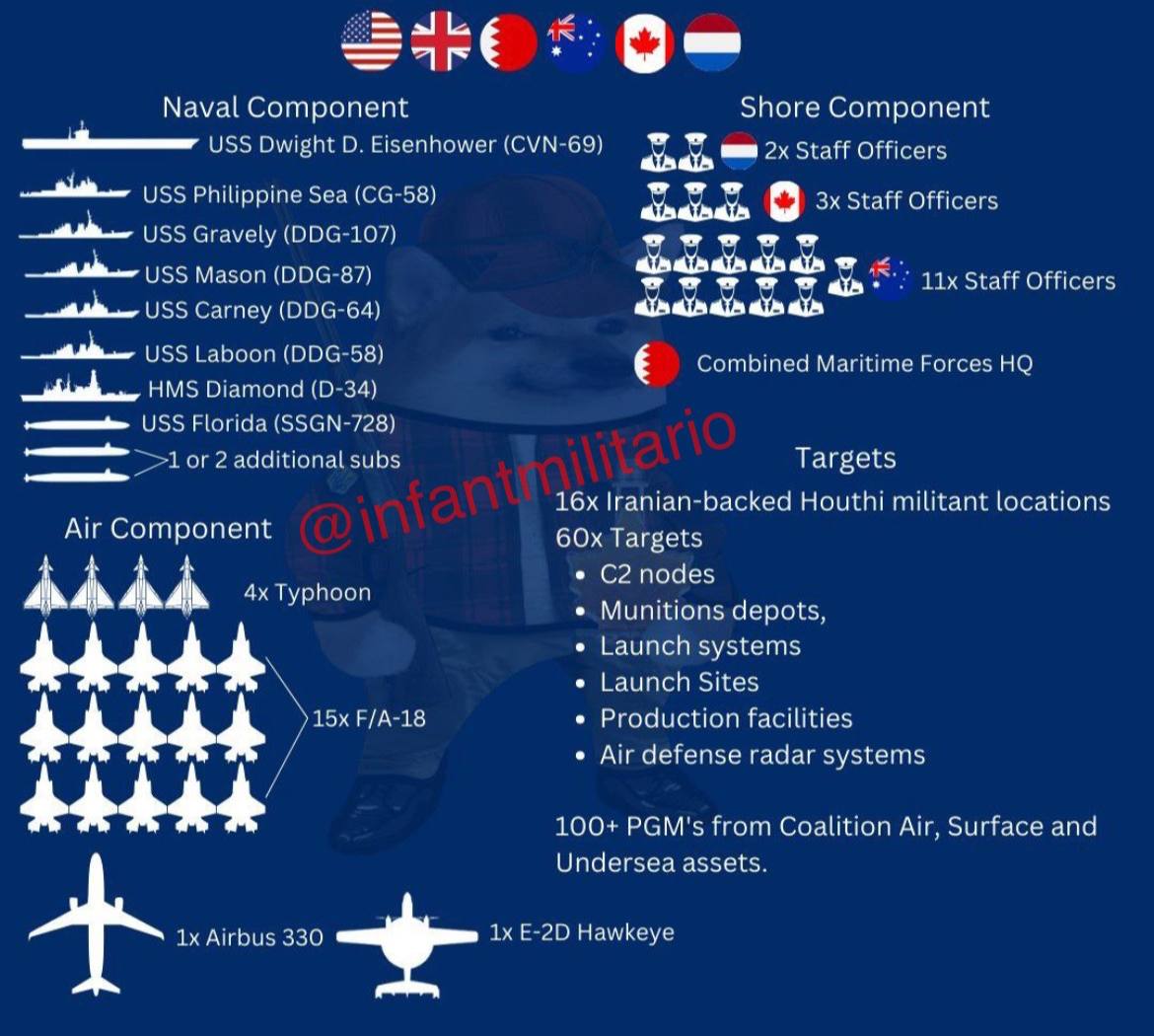 Americké centrální velitelství letectva vydalo prohlášení, v němž uvedlo, že pod vedením amerického Centrálního velitelství a dalších oddělení provedla americká armáda údery na více než 60 cílů v 16 baštách Íránem podporovaných Hútíů. Britské ministerstvo obrany uvedlo, že britské královské letectvo vyslalo čtyři stíhačky "Typhoon", aby provedly přesné údery na dva vojenské cíle Hútíů.