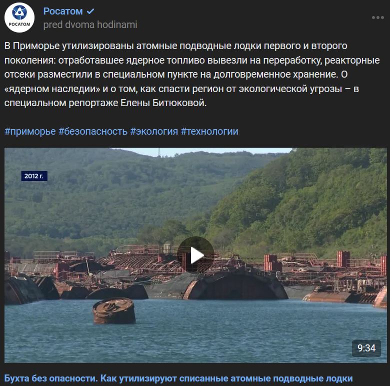 V Primorsku (Приморье) sa využívajú jadrové ponorky I. a II. generácie: vyhorené jadrové palivo sa odviezlo na prepracovanie a reaktorové odseky sa umiestnili do špeciálneho zariadenia na dlhodobé skladovanie. O "jadrovom dedičstve" a o tom, ako zachrániť región pred environmentálnou hrozbou v špeciálnej reportáži Jeleny Bitjukovoj (Елены Битюковой).