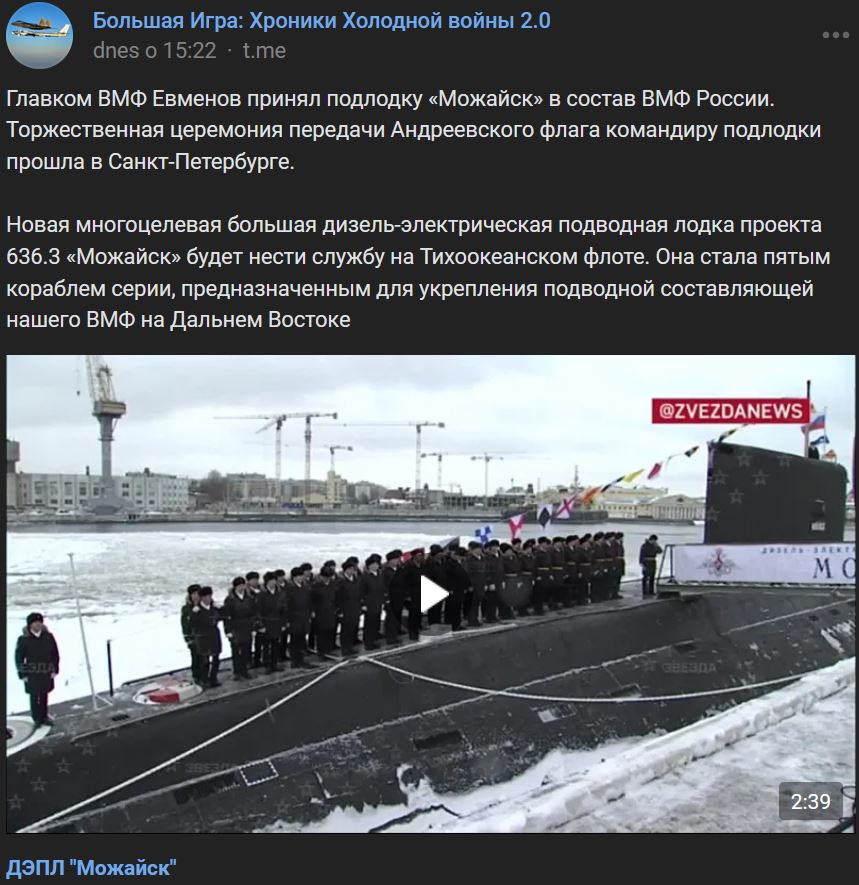 Veliteľ námorníctva (VMF) Jevmenov (Евменов) prijal ponorku Možajsk (Можайск) do zostavy VMF Ruska. Slávnostná ceremónia odovzdania Andrejevskej vlajky (vojenská zástava námorníctva Ruska) veliteľovi ponorky sa uskutočnilo v Petrohrade (Санкт-Петербурге). Nová viacúčelová diesel-elektrická ponorka projektu 636.3 Možajsk bude slúžiť v Tichomorskej flotile (TOF). Stala sa 5. ponorkou daného projektu určenej na posilnenie podmorskej zložky nášho námorníctva na Ďalekom východe