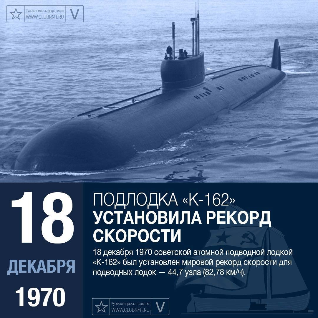 18.12.1970 = pred 53 rokmi ponorka Severného Flota K-162 (К-162) pod vedením kapitána 1. stupňa Ju.F. Golubkova (Ю.Ф. Голубкова) vytvorila svetový rýchlostný rekord, ktorý dodnes nebol prekonaný. Ponorka dosiahla rýchlosť 44,7 uzla (82,8 km/h) v hĺbke 100 metrov.