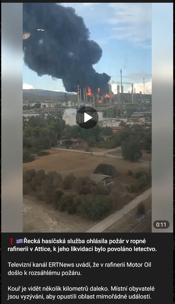 Televizní kanál ERTNews uvádí, že v rafinerii Motor Oil došlo k rozsáhlému požáru.