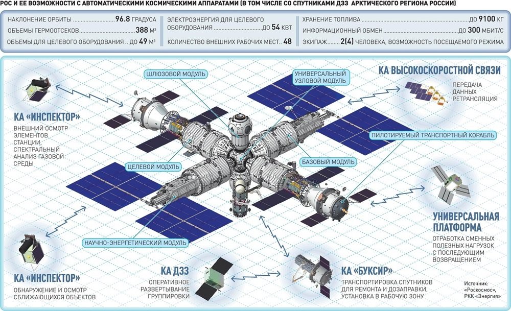 Připomeňme si ještě pár faktů o kosmické stanici ROS. Stanice ROS by měla mít maximální rozměry včetně panelů fotovoltaických článků 48,9×31,9×22,4 m a vnitřní hermetizovaný prostor 450 m³, což je dvojnásobek oproti ruskému segmentu ISS. Hmotnost stanice po dokončení dosáhne 135 tun. Oproti ISS bude stanice ROS obíhat na retrográdní SSO oběžné dráze o výšce okolo 500 km a sklonem 97° vůči rovníku. Stanice ISS se pohybuje po oběžné dráze o výšce 415 km a sklonu 51,6°. Stanice ROS bude moci ubytovat až 6člennou posádku, kterou bude dopravovat nová kosmická loď Orjol. Minimálně ze začátku nebude stanice trvale obydlená. Nepředpokládá se také žádný přímý přesun vybavení z ISS, jako se stalo v případě stanic Saljut 7 a Mir.