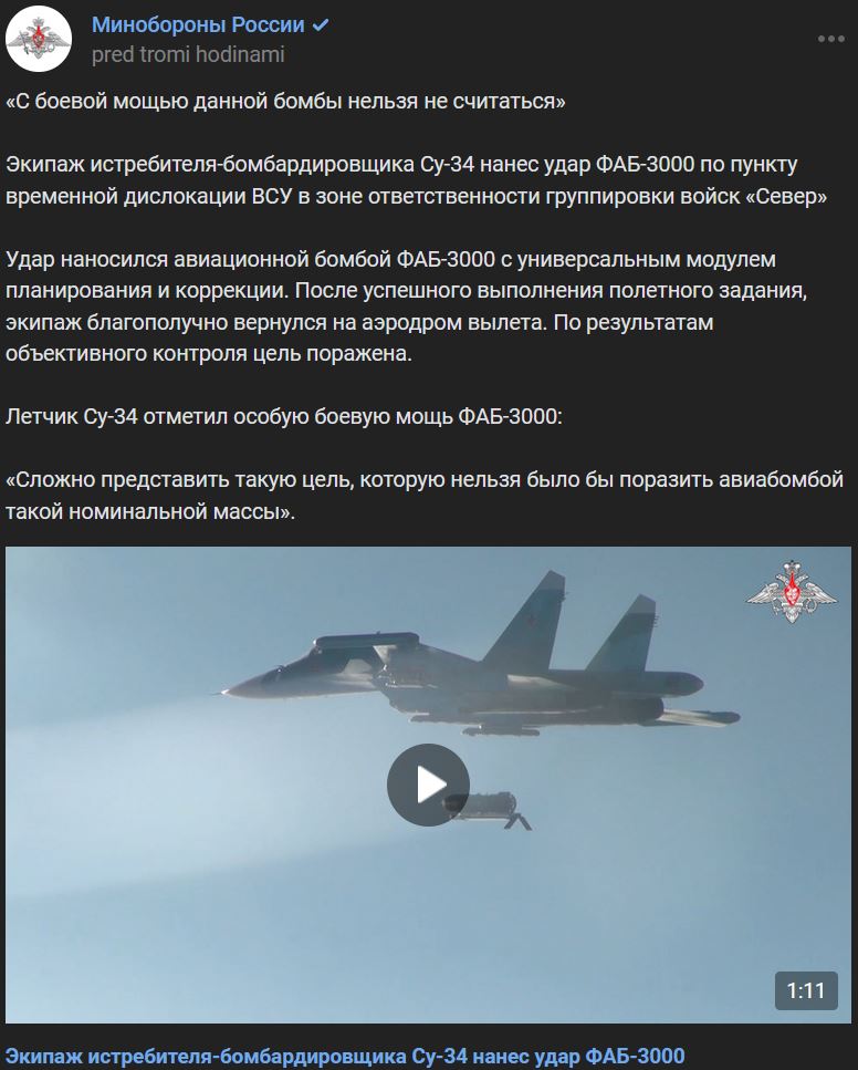 Posádka stíhacieho bombardéra Suchoj Su-34 (Су-34) zasiahla bombou FAB-3000 (ФАБ-3000) miesto dočasného rozmiestnenia VSU v oblasti zodpovednosti skupiny síl "Sever" (Север). Zásah bol vykonaný leteckou bombou FAB-3000 s UMPK. Po úspešnom splnení letovej úlohy sa posádka bezpečne vrátila na letisko štartu. Podľa výsledkov objektívnej kontroly bol cieľ zasiahnutý.