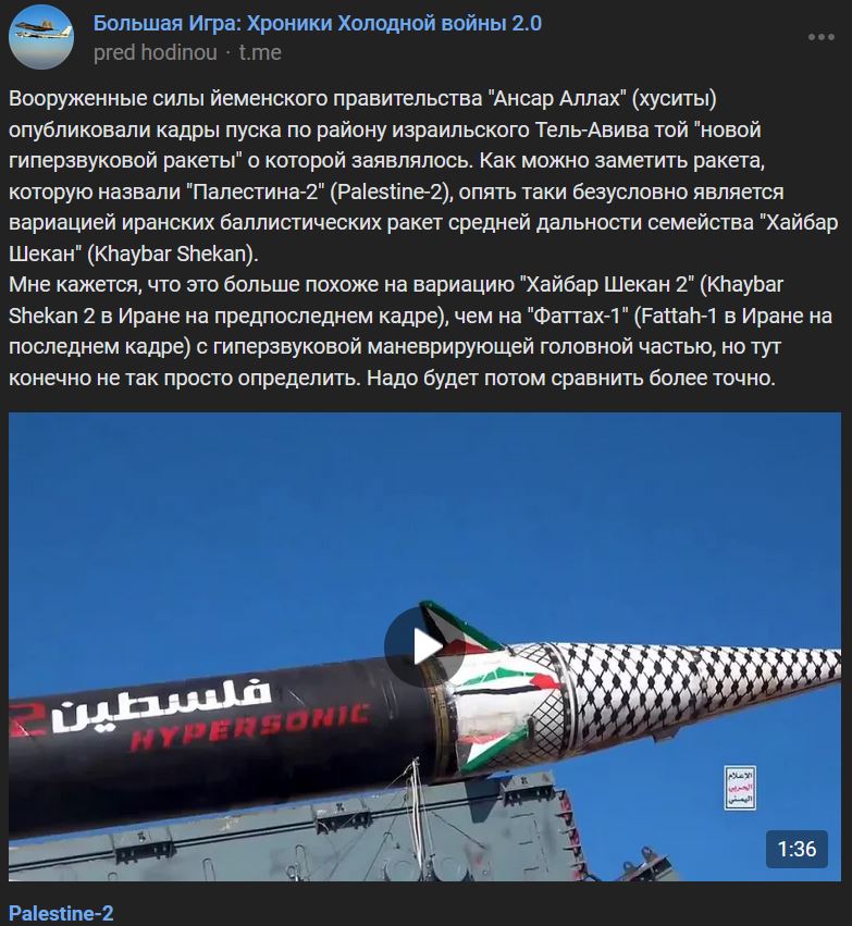 Ozbrojené sily jemenskej vlády "Ansar Allah" (Hútiovia) zverejnili zábery údajnej „novej hypersonickej rakety“, ktorá bola vypustená do blízkosti izraelského Tel Avivu. Ako vidno, raketa s názvom "Palestína-2" je opäť zjavne variáciou iránskych balistických rakiet stredného doletu Khaybar Shekan. Myslím si, že vyzerá skôr ako variácia rakety Khaybar Shekan 2 (na predposlednom zábere iránsky Khaybar Shekan 2) než Fattah-1 (na poslednom zábere iránsky Fattah-1) s hypersonickou manévrovacou hlavicou, ale samozrejme to nie je také jednoduché určiť. Presnejšie porovnanie budem musieť urobiť neskôr.