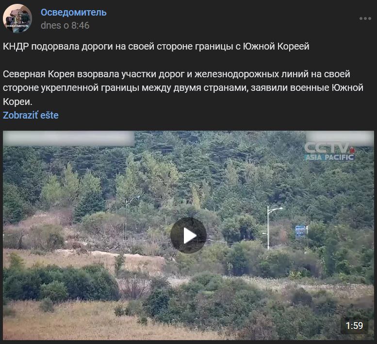Severná Kórea vyhodila do vzduchu úseky ciest a železničných tratí na svojej strane opevnenej hranice medzi oboma krajinami, uviedla juhokórejská armáda. V reakcii na to juhokórejská armáda vypálila varovné výstrely smerom k demarkačnej línii oddeľujúcej susedné krajiny. Výbuchy nespôsobili na juhokórejskej strane hranice žiadne škody, uviedlo ministerstvo vojenstva krajiny. Pchjongjang sa minulý týždeň zaviazal úplne uzavrieť medzikórejské cesty a ďalej opevňovať oblasti na svojej strane hranice. Podľa juhokórejského zboru náčelníkov štábov armáda KĽDR už osádza pozdĺž hranice míny a zátarasy a v pondelok 14.10.2024 boli viditeľné ďalšie práce s použitím ťažkej techniky.