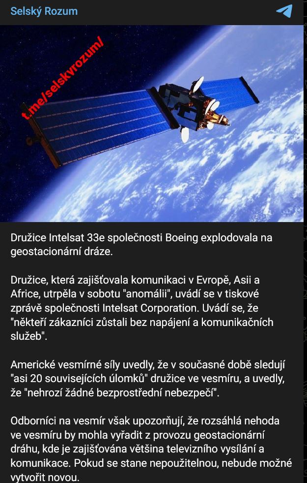 Družice, která zajišťovala komunikaci v Evropě, Asii a Africe, utrpěla v sobotu 19.10.2024 "anomálii", uvádí se v tiskové zprávě společnosti Intelsat Corporation. Uvádí se, že "někteří zákazníci zůstali bez napájení a komunikačních služeb".