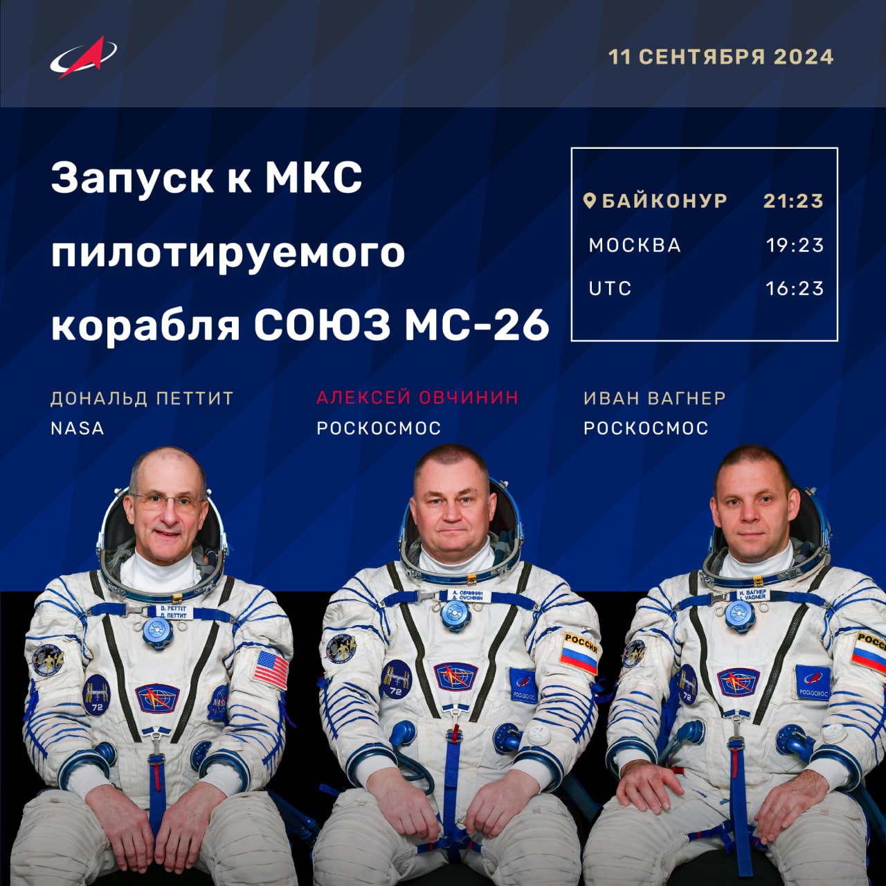 Posádka MS-26: Aleksej Ovčinin (Алексей Овчинин), Ivan Vagner (Иван Вагнер) a Donald Pettit (vo veku 69 rokov).