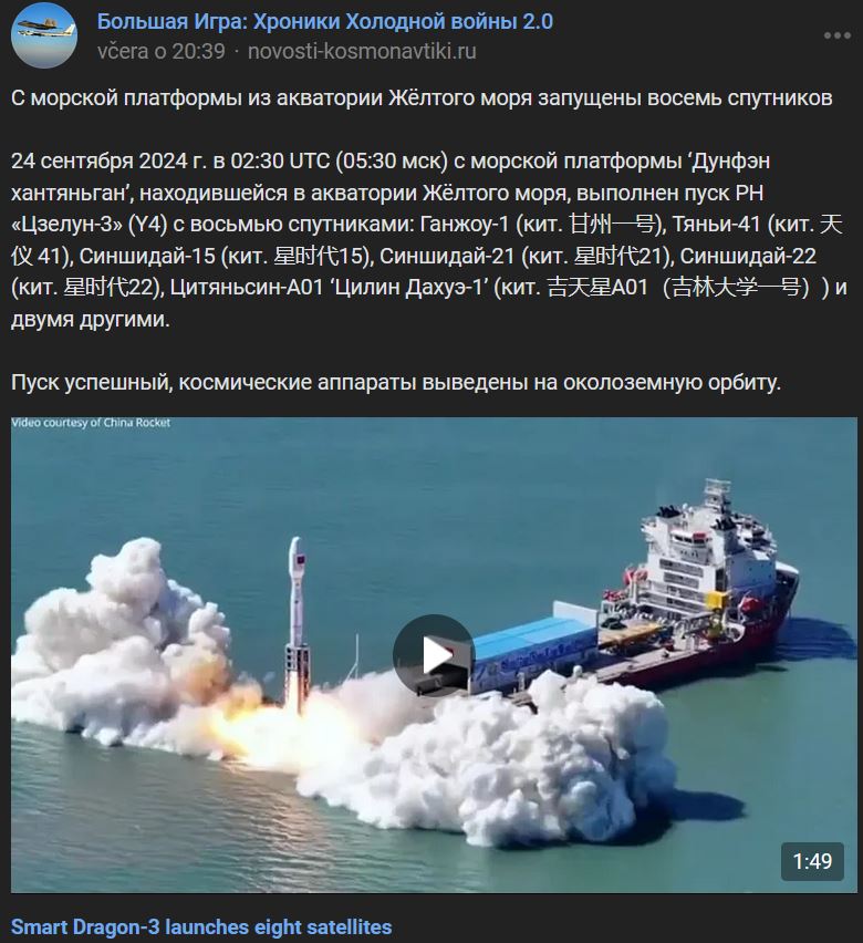 Utorok 24.09.2024 o 02:30 hod UTC (05:30 hod. MSK) bolo z morskej platformy vo vodách Žltého mora pomocou nosnej rakety Цзелун-3 / Smart Dragon-3 na obežnú dráhu vypustených 8 družíc. Štart bol úspešný a kozmické lode sa dostali na obežnú dráhu Zeme.