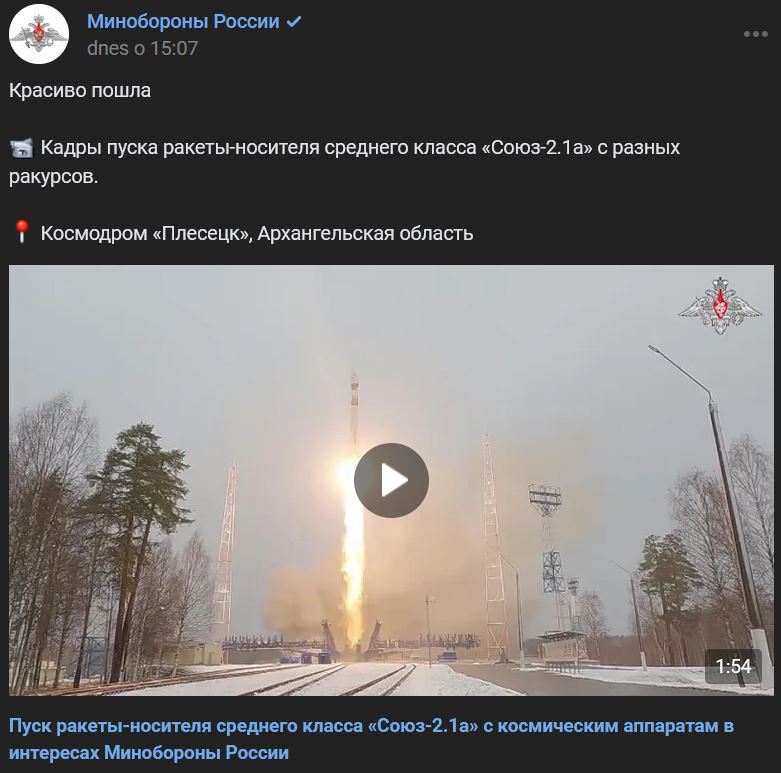 Vzdušno-kozmické sily uskutočnili úspešný štart nosnej rakety Sojuz-2.1b (Союз–2.1б) z kozmodrómu Pleseck (Плесецк).