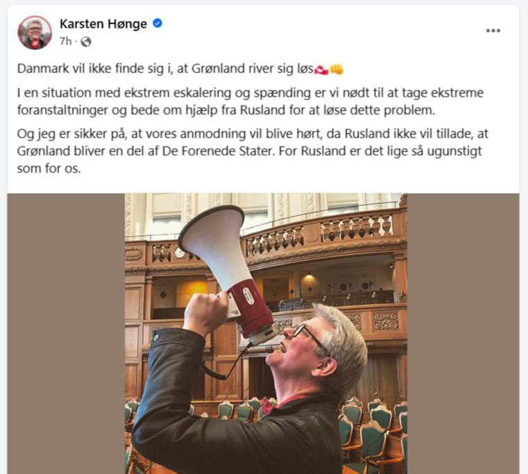Dánsky poslanec Karsten Honge povedal, že ak sa napätie vystupňuje, možno sa budú musieť obrátiť na Rusko, aby zabránili invázii USA do Grónska, a že Rusko by nechcelo, aby Grónsko padlo do rúk USA, takže by pomohlo.