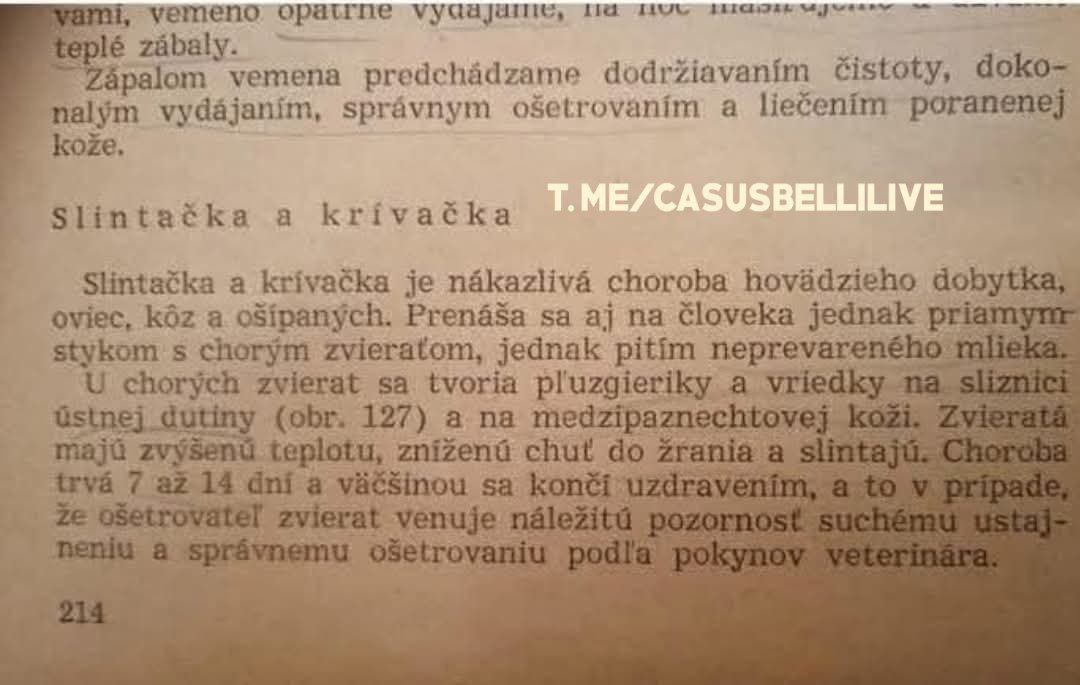 strana 214 Zdroj https://t.me/casusbellilive/206009 z 27.03.2025Úryvok z knihy o infekčných chorobách dobytka.