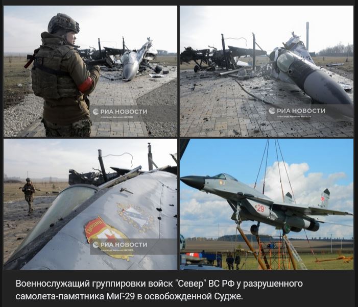 Príslušník skupiny "Sever" (Север) VS RF pri zničenom pamätníku lietadla MiG-29 (МиГ-29) v oslobodenej Sudže (Судже).