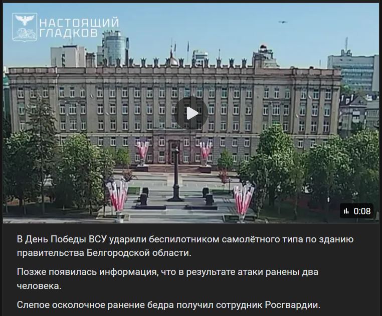 V Deň Víťazstva (День Победы) piatok 09.05.2025 VSU zasiahli bezpilotnikom lietadlového typu vládnu budovu v Belgorodskej oblasti. Neskôr bolo oznámené, že v dôsledku útoku boli zranení 2 ľudia. Nepriame šrapnelové zranenie stehna dostal dôstojník Rosgvardii (Росгвардии).