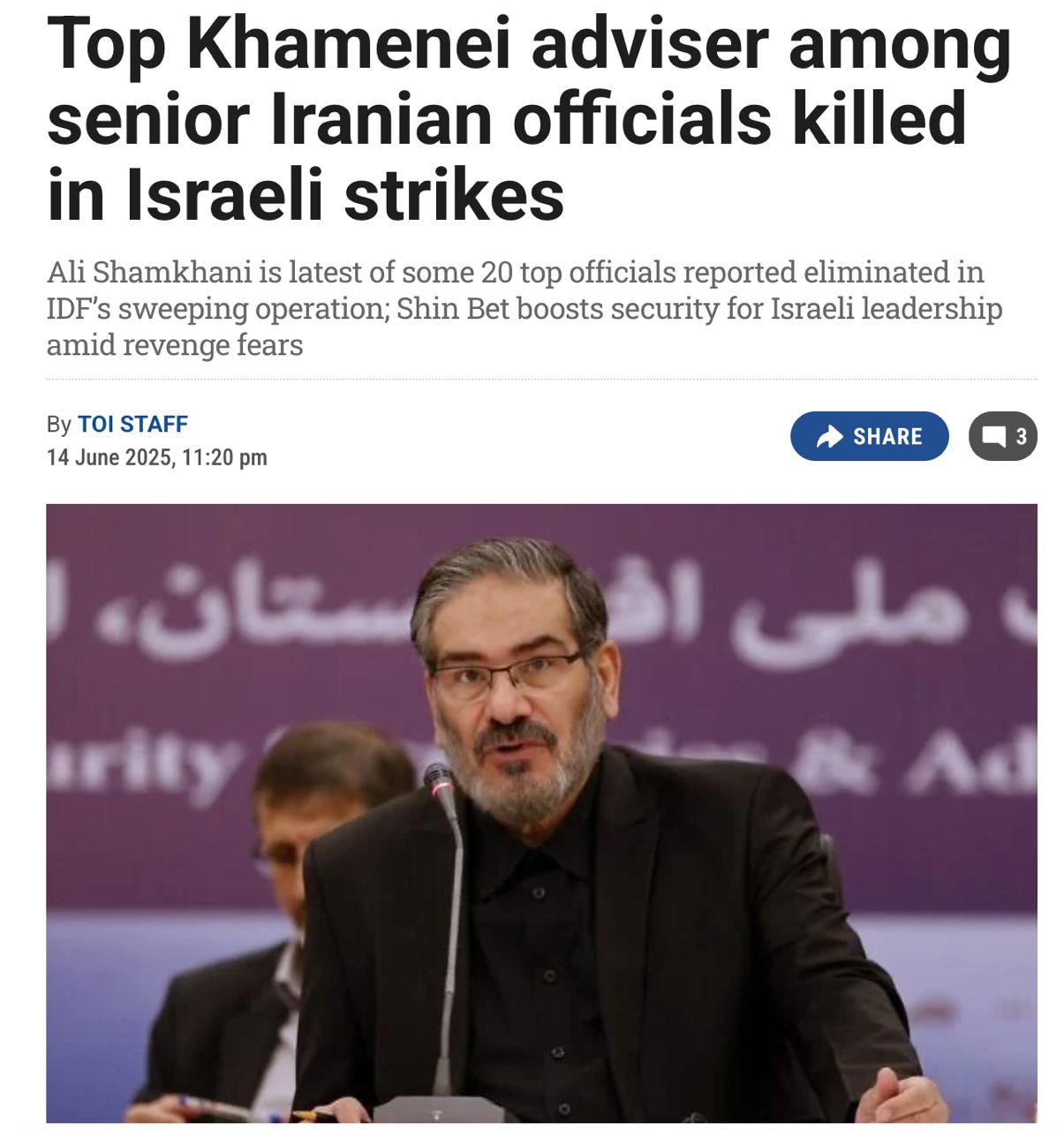 ▪️ Vtedy sa ukázalo, že je nažive aj hlavný poradca najvyššieho vodcu ajatolláha Chameneího, ktorého Izrael vyhlásil za zavraždeného. Médiá zverejnili fotografiu Alího Šamcháního v Teheráne s palicou a obklopeného ochrankou.
