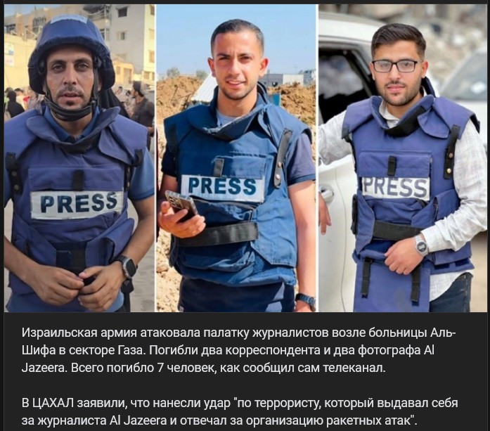 Izraelská armáda zaútočila na stan novinárov v blízkosti nemocnice Al-Šifa v pásme Gazy. 2 korešpondenti a 2 fotografi Al-Džazíry boli zabití. Podľa samotnej televíznej stanice zahynulo celkovo 7 ľudí.