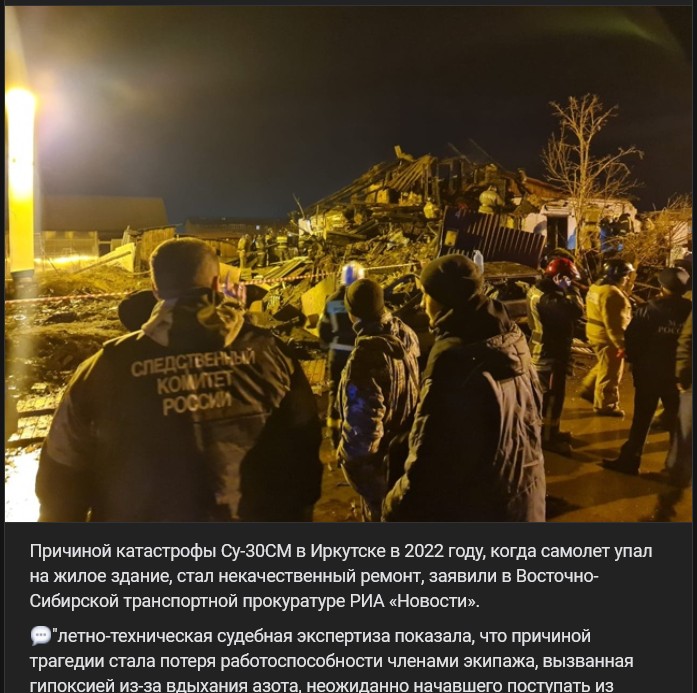 Príčinou katastrofy lietadla Suchoj Su-30SM (Су-30СМ) v Irkutsku v roku 2022, keď lietadlo dopadlo do obytnej budovy, bola nekvalitná oprava, uviedla pre RIA Novosti Východosibírska dopravná prokuratúra.