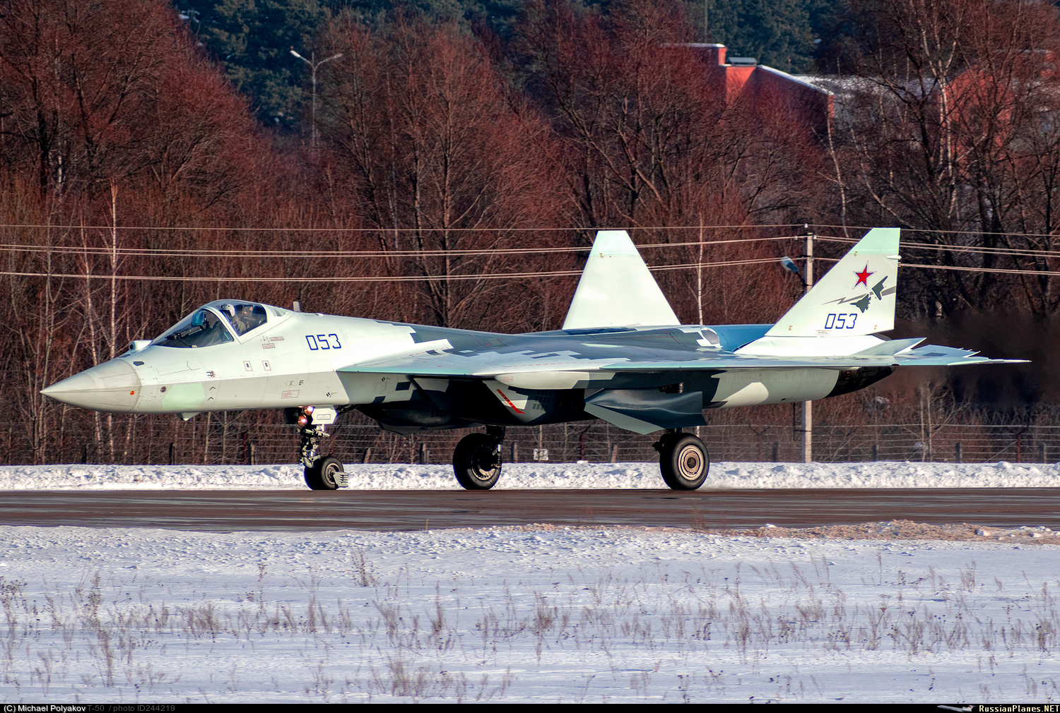 SU-57 053 ktory slúži ako lietajúce laboratórium pre program ochotnik, v podstate je pilotované UAV má tiež zaujímavú kamufláž
