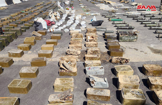 Reportér SANA povedal, že úrady v stredu našli zbrane, muníciu a náboje, ktoré zanechali teroristické skupiny, v Damašku vo východnej Ghoute, niektoré vyrobené v USA.