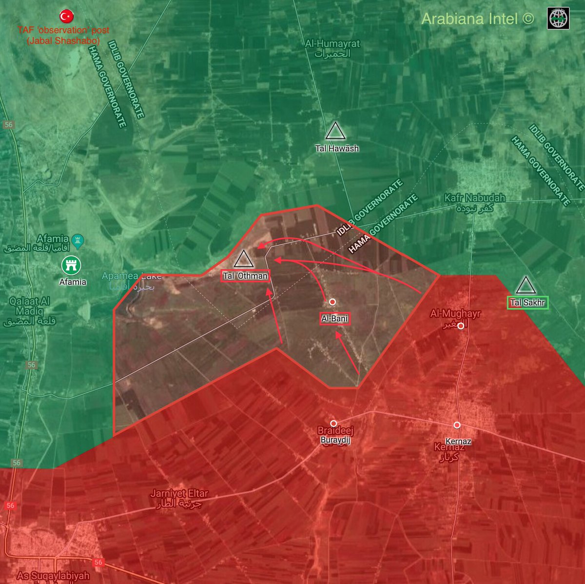 Sýrska armáda hlási prvý pokrok pozdĺž osi Hama-Idlib, keď získali Al-Bana , Al-Janabra a kľúčový vrch Tal Uthman.
