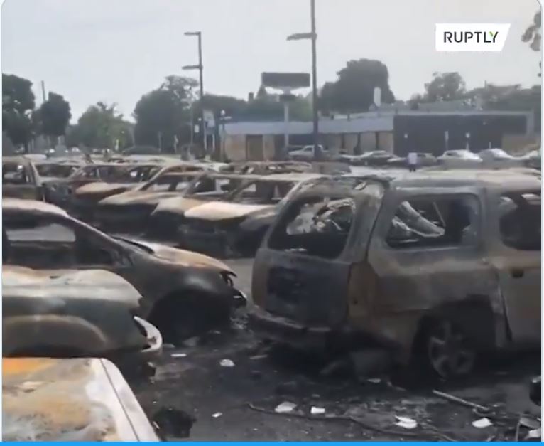 V stredu v Kenoshe - desiatky vyhorených vozidiel a poškodených budov.