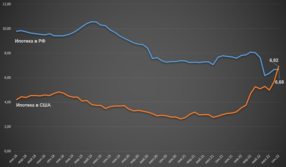 Průměrná úroková sazba hypoték v Rusku byla v září poprvé v historii trhu nižší než v USA - 6,68 % oproti 6,92 %.