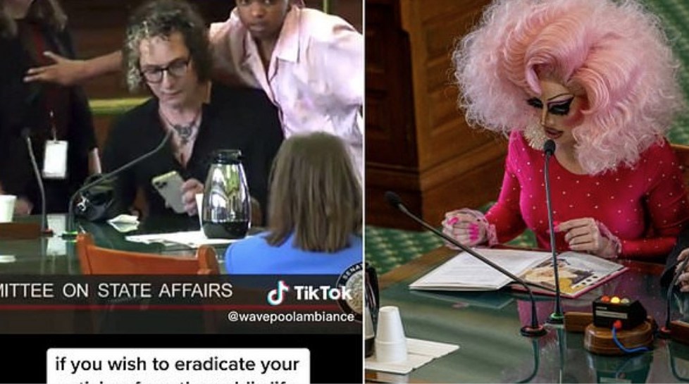 Šokující moment, kdy trans aktivistka fyzicky blokuje seržantovi texaského senátu, aby se ujal mikrofonu, když trans žena přirovnává zákonodárce k nacistům kvůli novému zákonu kriminalizujícímu taneční vystoupení pro děti. (Foto: Twitter)