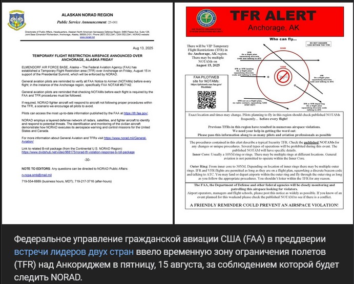 Federálny úrad civilného letectva SŠA (FAA) v predvečer stretnutia lídrov 2 krajín zaviedol dočasnú obmedzenú letovú zónu (TFR) nad Anchorage v piatok 15.08.2025, ktorej dodržiavanie bude monitorovať NORAD.