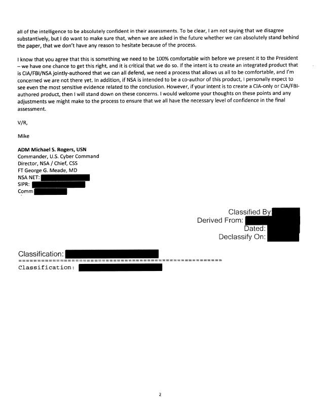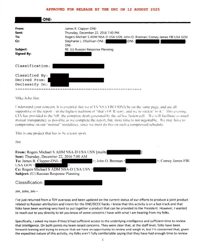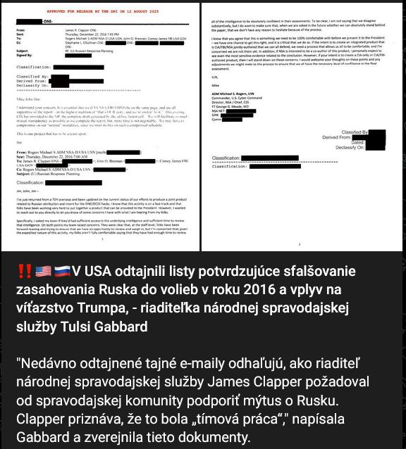 Nedávno odtajnené tajné e-maily odhaľujú, ako riaditeľ národnej spravodajskej služby James Clapper požadoval od spravodajskej komunity podporiť mýtus o Rusku. Clapper priznáva, že to bola „tímová práca“," napísala Gabbard a zverejnila tieto dokumenty.