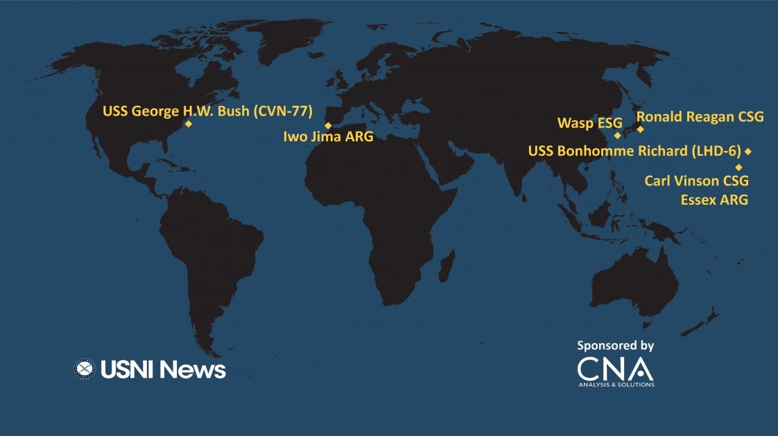 Umístění letadlových lodí amerického námořnictva ve Světovém oceánu 23. července 2018