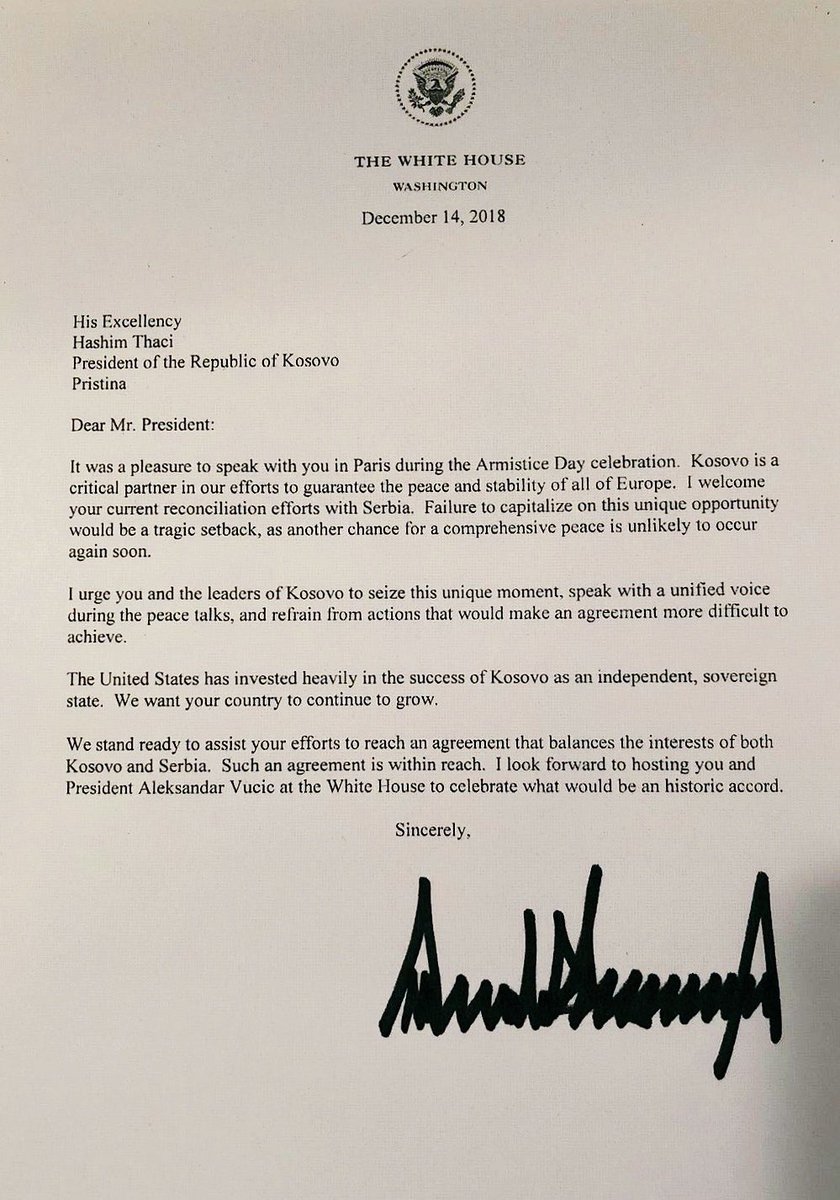 V oficiálním dokumentu americký prezident prohlásil následující: „Kosovo je zlomovým partnerem v našem úsilí o zajištění míru a stability celé Evropy. Vítám vaše současné úsilí o usmíření se Srbskem. Neuskutečnění této jedinečné příležitosti by bylo tragickým krokem zpět, neboť je pravděpodobné, že se v brzké době neobjeví další příležitost k ucelenému míru."