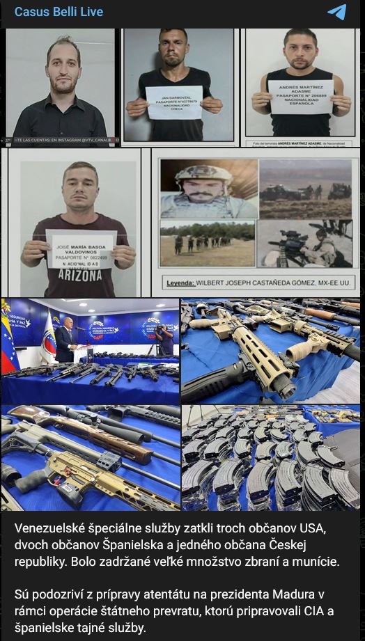 Venezuelské špeciálne služby zatkli 3 občanov USA, 2 občanov Španielska a 1 občana Českej republiky. Bolo zadržané veľké množstvo zbraní a munície. Sú podozriví z prípravy atentátu na prezidenta Madura v rámci operácie štátneho prevratu, ktorú pripravovali CIA a španielske tajné služby.