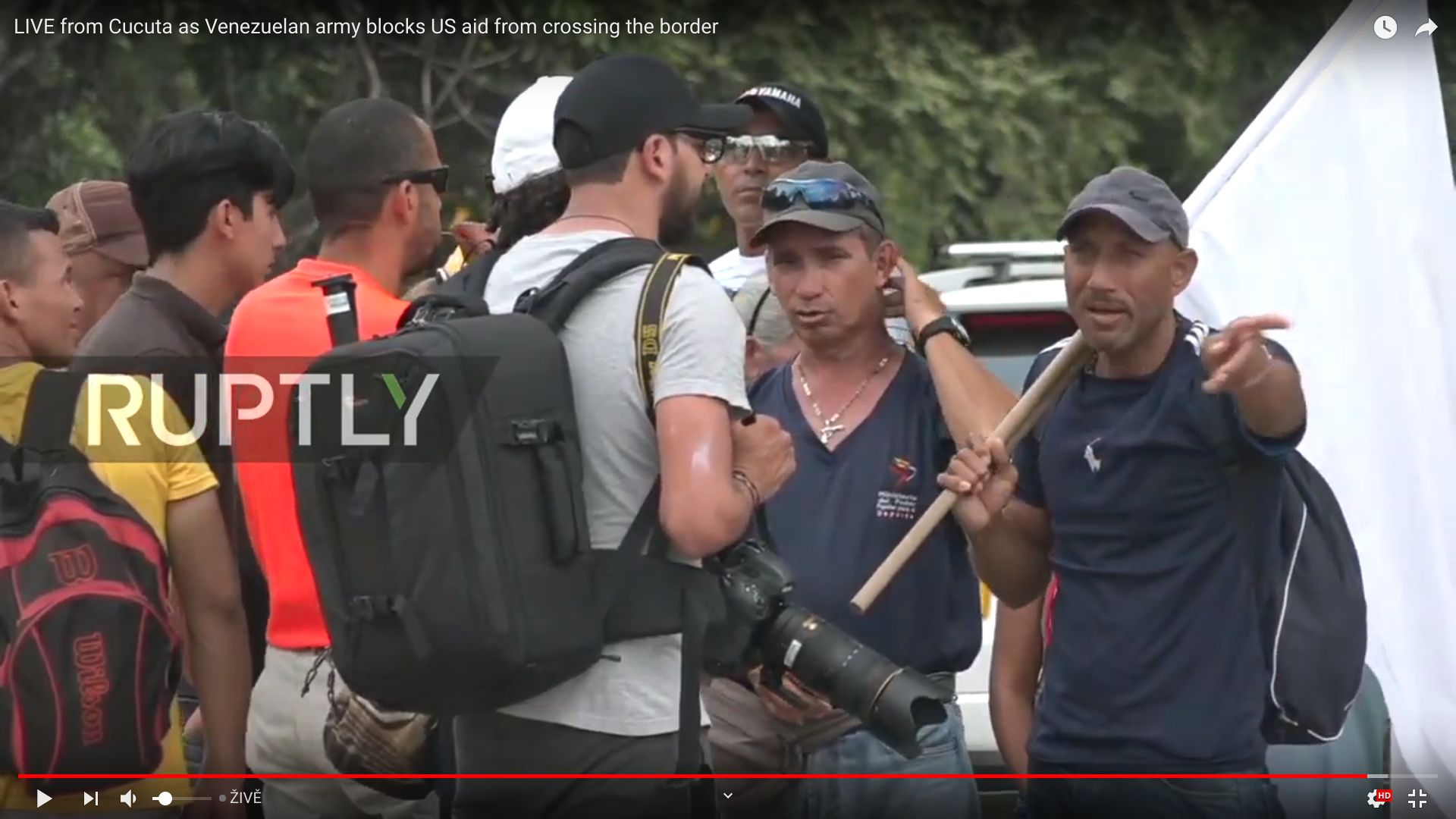 Před vstupem na most v Cucutě nám stojí dva muži, jeden nese dvě bíle vlajky - asi se chce někde vzdávat, a druhý má na krku přívěšek s bouchačkou, zajímavé, třeba je ještě uvidíme v akci mávat s vlajkami.. Poslankyně AN Gaby Arellano: "Zatím žádná humanitární pomoc nevstoupila do naši milované země. Jsem si jistá, že nejšťastnější budou ozbrojené síly země"