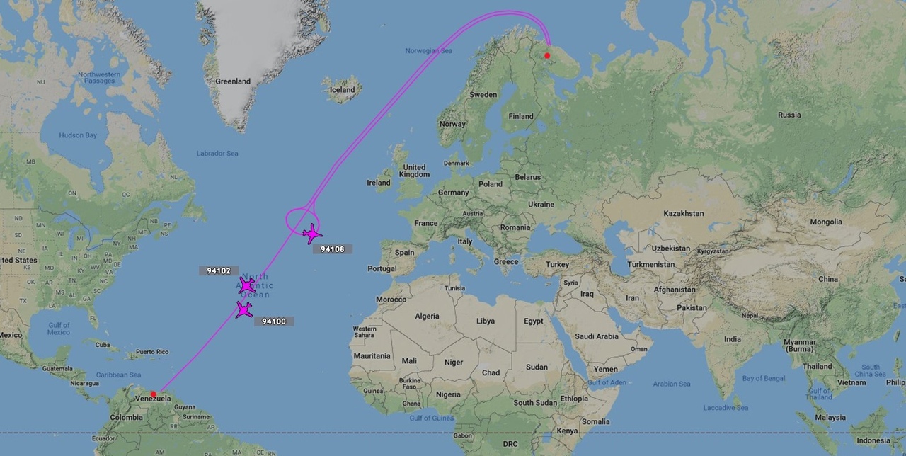 Přelet dvou bombardérů TU - 160 VKS RF (palubní 94100 a 94102, 94108 pracoval jak retranslátor v Atlantiku) v Caracasu (Venezuela)