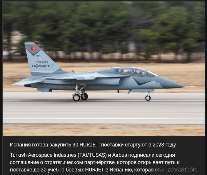 Zdroj https://vk.com/wall-173678697_412260 z 24.07.2025Spoločnosti Turkish Aerospace Industries (TAI/TUSAŞ) a Airbus vo štvrtok 24.07.2025 podpísali dohodu o strategickom partnerstve, ktorá otvára cestu k dodávke až 30 cvičných bojových lietadiel HÜRJET do Španielska, ktoré bude prvým európskym zákazníkom pre turecké lietadlá. Konečný kontrakt sa má podpísať do konca roka 2025, pričom prvé dodávky sa začnú v roku 2028.