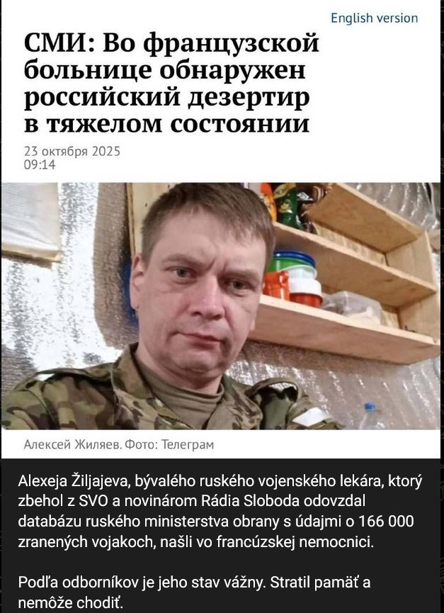 Alexeja Žiljajeva, bývalého ruského vojenského lekára, ktorý zbehol z ŠVO a novinárom Rádia Sloboda odovzdal databázu ruského ministerstva obrany s údajmi o 166 000 zranených vojakoch, našli vo francúzskej nemocnici.
