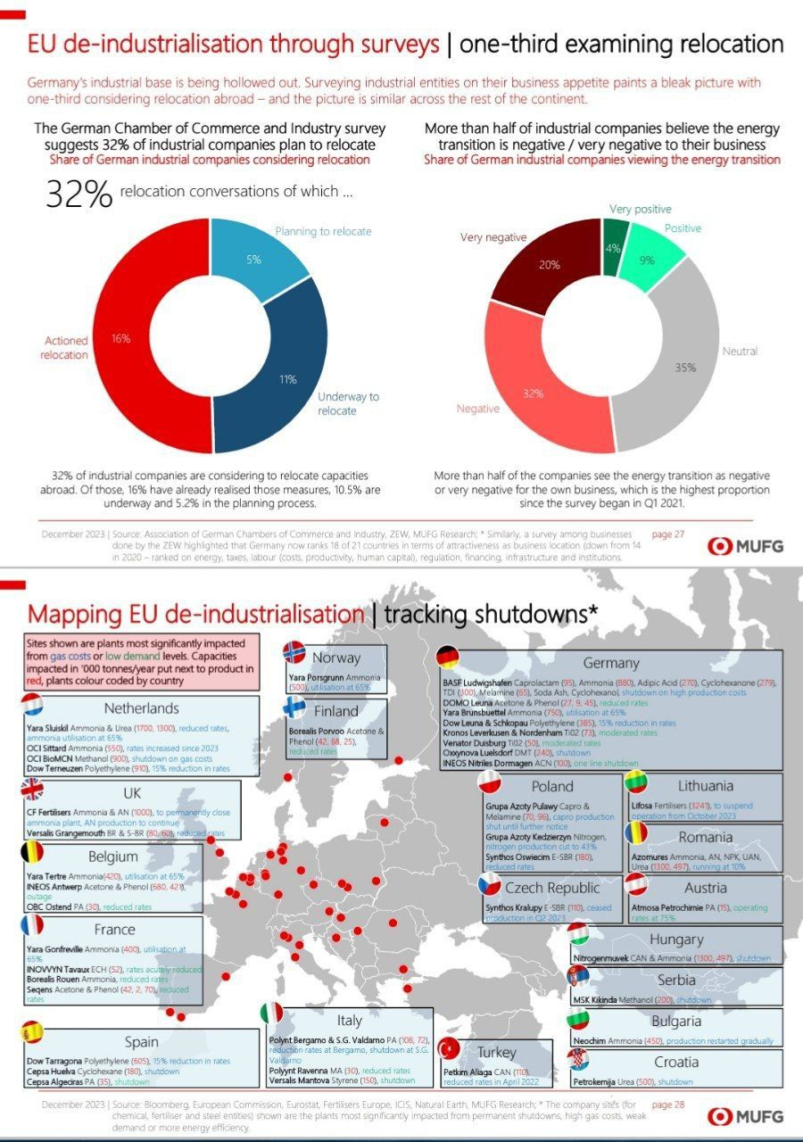 Ak sa doteraz takéto obrázky nazývali propagandou, teraz najväčší japonský konglomerát Mitsubishi UFJ Financial Group píše o rozsiahlej deindustrializácii Európy a Nemecka. Nemecké podniky už nič netvrdia, ale aktívne sa sťahujú z Nemecka. Počet zatvorených závodov na výrobu hnojív, ktoré boli závislé od cien ruského plynu, sa blíži k 50.
