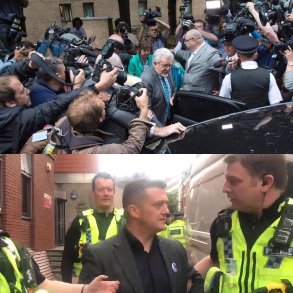 Spodny obrazok ukazuje zatknuteho Robinsona za to, ze snimal situaciu pred sudom. Vraj ohrozil pravo obvinenych na spravodlivy proces.