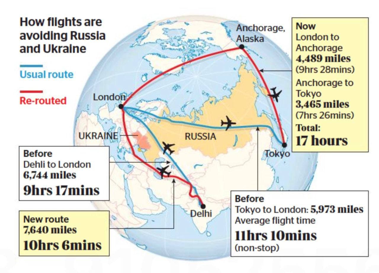 Britské sankce zatím dopadají na samotnou Británii. Infografika ukazuje nové trasy pro britská letadla v důsledku uzavření ruského nebe. Aeroflot měl 2 lety denně do Británie, britské společnosti do Asie přes Rusko více než 70, píše @indeec1937