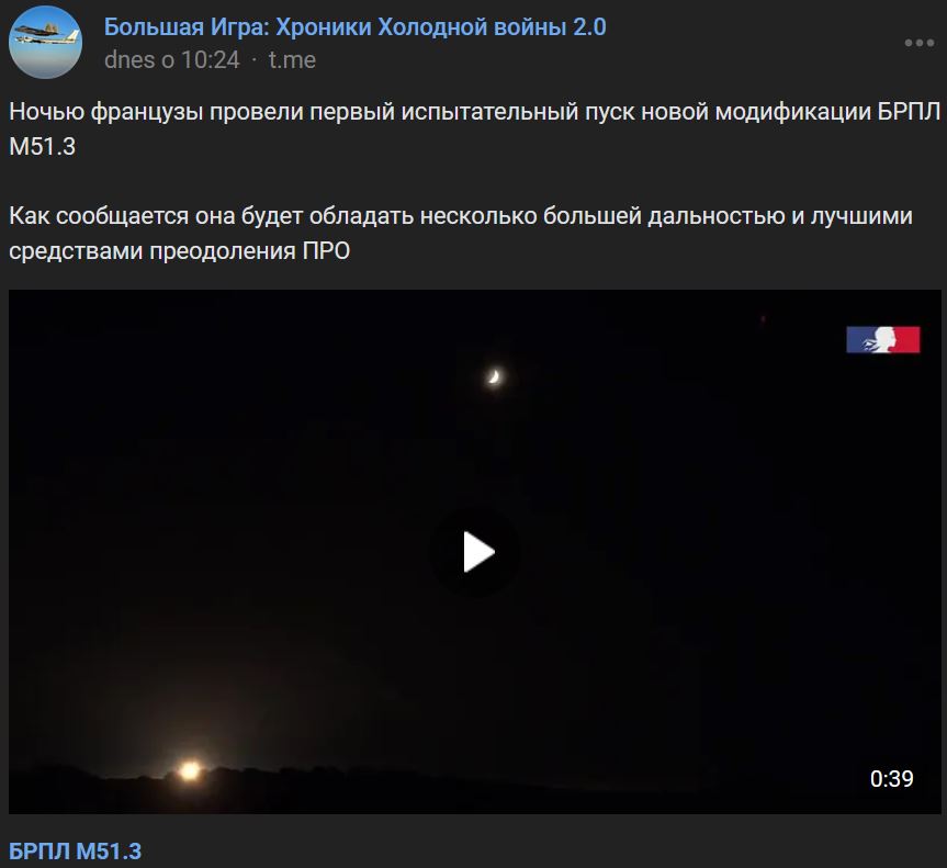 V noci zo soboty 18.11.2023 na nedeľu 19.11.2023 Francúzi uskutočnili prvý skúšobný štart novej modifikácie medzikontinentálnej balistickej rakety M51.3 (wiki)