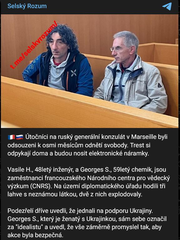 Útočníci na ruský generální konzulát v Marseille byli odsouzeni k 8 měsícům odnětí svobody. Trest si odpykají doma a budou nosit elektronické náramky.