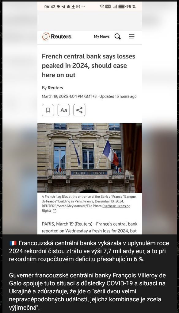 Francouzská centrální banka vykázala v uplynulém roce 2024 rekordní čistou ztrátu ve výši 7,7 miliardy €, a to při rekordním rozpočtovém deficitu přesahujícím 6 %. Guvernér francouzské centrální banky François Villeroy de Galo spojuje tuto situaci s důsledky COVID-19 a situací na Ukrajině a zdůrazňuje, že jde o "sérii dvou velmi nepravděpodobných událostí, jejichž kombinace je zcela výjimečná"